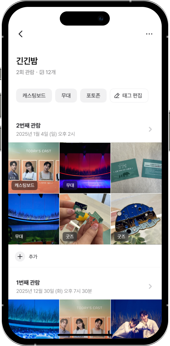 공연의 회차별로 정리되어, 언제든 다시 꺼내 볼 수 있어요.