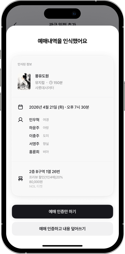 시티가 예매 정보를 불러오는 동안 설레는 관극의 순간에만 집중해요.흩어져 있던 내역을 직접 입력하거나, 주요 예매처 불러오기로