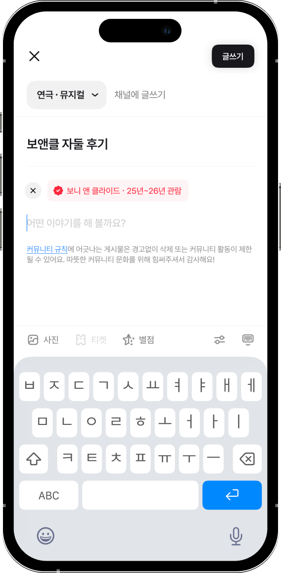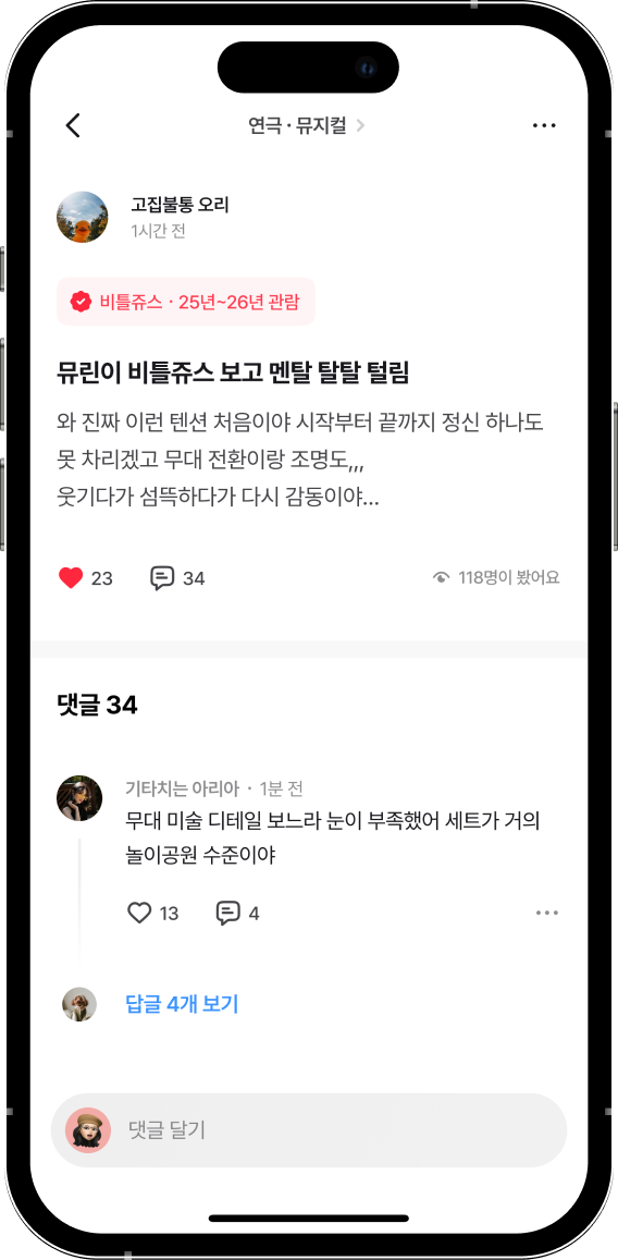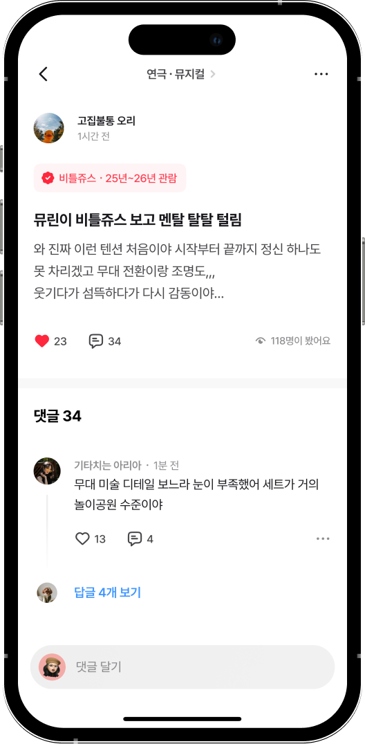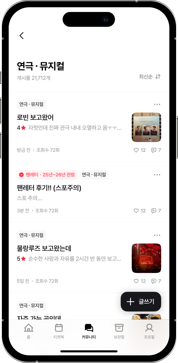 관심 있는 장르 채널에서 비슷한 취향을 가진 사람들과 소통할 수 있어요.공연의 기억이 더 선명해질 거예요