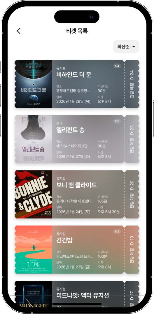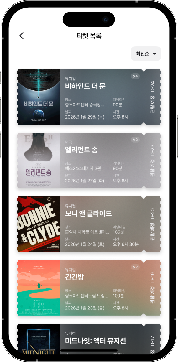 지류 티켓을 모아보듯 관극 기록을 확인할 수 있어요.